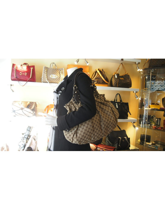 Composizione: tessuto GG di colore beige con finiture in pelle scamosciata di colore ottanio